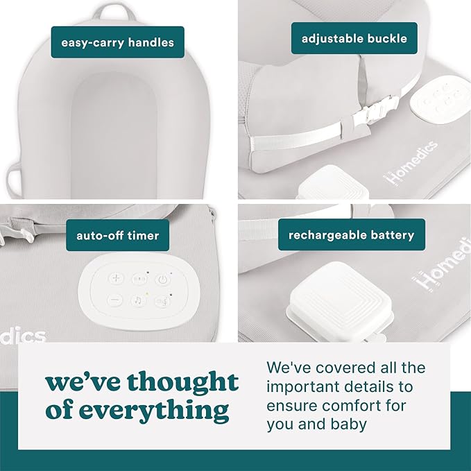 - Sound & Vibration: Features 4 synchronized sound and vibration options; soothes baby by mimicking the feeling of being in the womb; choose from Heartbeat, Shushing, Womb, and White Noise sounds; use sound and vibration together or independently