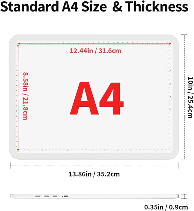 - 【Good for Your Eyes】The Tracking light box maximum brightness up to 9000LUX,Meet your various uses.Our light source is both soft and uniform, effectively safeguarding your eyes from potential harm. This A4 light table is entirely free of luminous spots or strobing effects. Thanks to our advanced eyesight - protecting technology, you can use the tracing light for extended periods without any adverse impact on your eyes