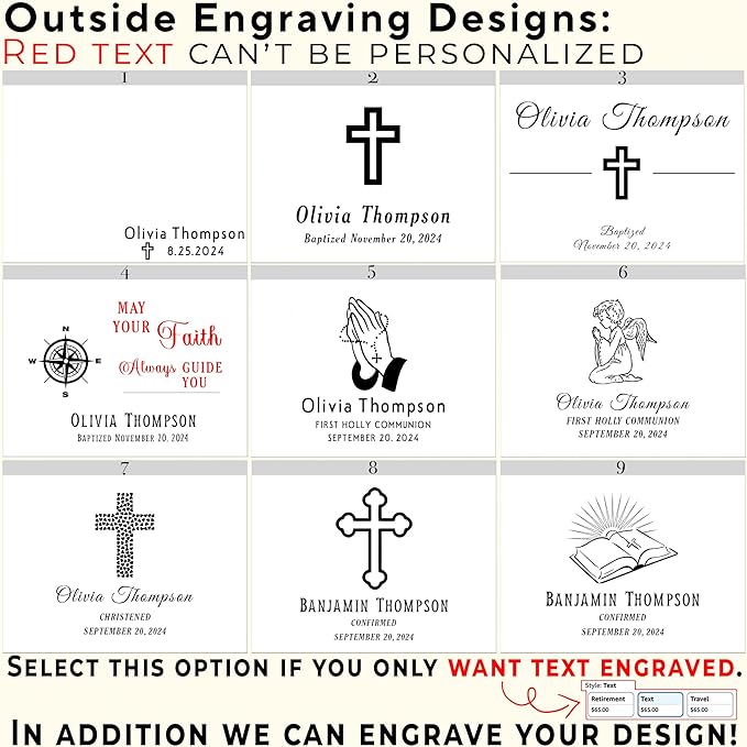 - Customizable: Personalize your first communion box with a name and date. Each design can be changed to "Baptized", "Christened," "Confirmed," "First Communion," etc. or removed entirely if indicated. We’ll use the font style showcased in the photos. The inside lid can also be engraved with your text(different font options). Create a unique and meaningful gift!