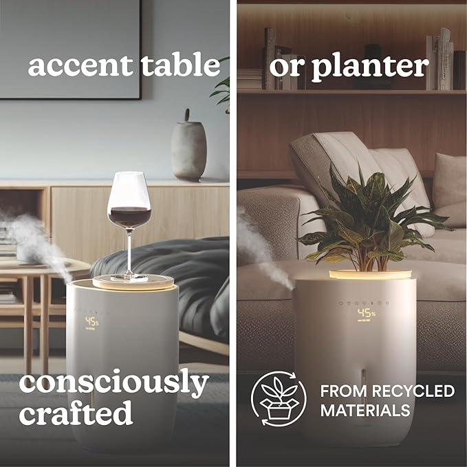 - Style + Substance: The sleek, modern design effortlessly blends into any decor with smooth surfaces and a touchscreen interface, and is consciously crafted with recycled materials. The tabletop can be removed so the humidifier can be used with your favorite 6โ small plant.