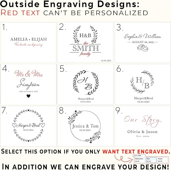 - Customized: this walnut wedding box can be engraved with various designs offered adding the couple's names, family name, and dates to make it unique. We’ll use the font style showcased in the photos. Additionally, it can be engraved inside, on the other lid's side, to create a surprise message for the recipient