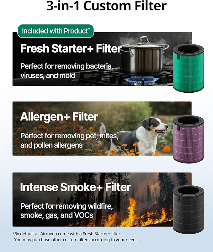 - Advanced 3-in-1 Filteration system combines a vacuumable pre-filter, activated carbon, and a True HEPA Filter effectively reduces up to 99.999% of particles down to 0.01 microns in the air, including pollen, pollutants and other allergens. It also reduces more than 99% of volatile organic compounds and reduces fumes such as NH3 and CH3CHO.