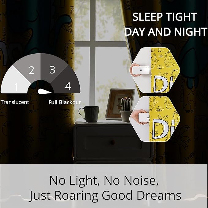 Dinosaur Blackout Curtains for Kids Room - 2 Panels, Each W52×L63, 100% Blackout, Thermal Insulated, Noise Reducing, Perfect for Kids Room and Nersury