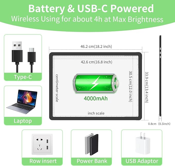 - [Long-Lasting 4000mAh Battery & Fast USB-C Charging]: Portable A3 light table with 4+ hours runtime at max brightness (8+ hours at medium). Recharge via universal USB-C in 3.5 hours โ compatible with laptops, power banks, and car chargers. No more cable clutter! Stable USB-C port outperforms fragile micro-USB, ideal for on-the-go crafting