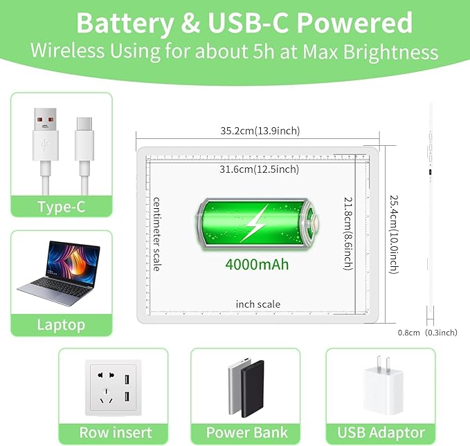- [Long-Lasting 4000mAh Battery & Fast USB-C Charging]: Portable A4 light table with 4+ hours runtime at max brightness (8+ hours at medium). Recharge via universal USB-C in 3.5 hours โ compatible with laptops, power banks, and car chargers. No more cable clutter! Stable USB-C port outperforms fragile micro-USB, ideal for on-the-go crafting