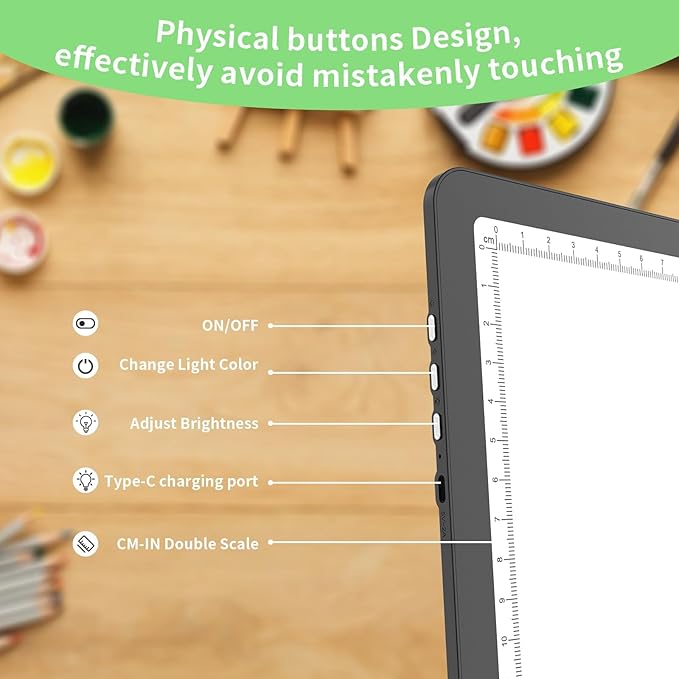 - [6 Levels/Stepless Dimming & 3 Light Modes for Eye Comfort]: Long-press the physical button for stepless brightness control (5400 Lux max) โ perfect for detailed tasks like weeding vinyl or diamond painting. Short-press to adjust 6 levels brightness. 3 color modes (white/warm white/warm yellow) eliminate glare, evenly illuminating thick papers and canvases. Auto-memory function retains your last setting, while flicker-free technology reduces eye strain during extended tracing sessions
