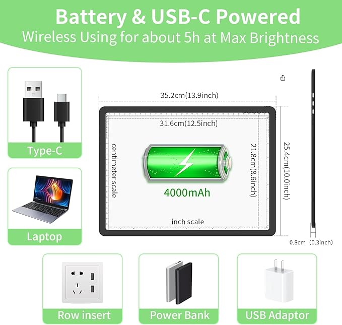 - [Long-Lasting 4000mAh Battery & Fast USB-C Charging]: Portable A4 light table with 4+ hours runtime at max brightness (8+ hours at medium). Recharge via universal USB-C in 3.5 hours โ compatible with laptops, power banks, and car chargers. No more cable clutter! Stable USB-C port outperforms fragile micro-USB, ideal for on-the-go crafting