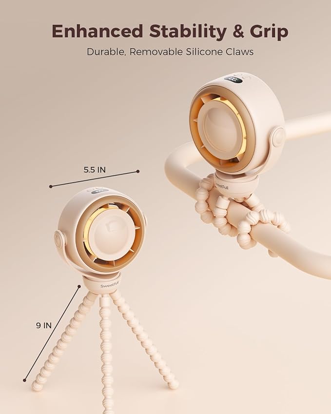 SWEETFULL Baby Stroller Fan - 4000mAh Rechargeable 4-Speed Quiet with LED Display & Night Light, Mini Portable 360° Clip On Safe Fan for Car Seat, Crib, Travel - Brown