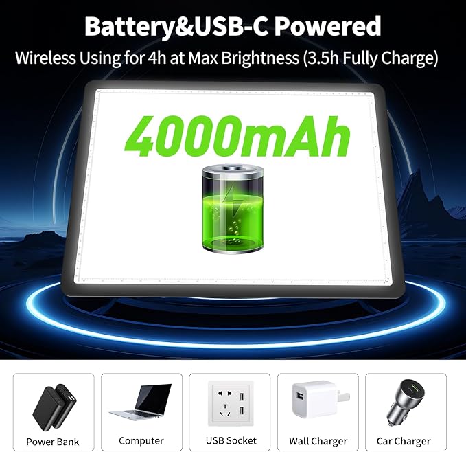 - 【 Wireless A3 Tracing Lightbox 】 With the built-in 4000mAh lithium battery, Elice LED Light Drawing Board allows you to work for 4 hours wirelessly with the MAX brightest mode continuously. It's more convenient for you to use this cordless Light Table anytime and anywhere without bringing any adaptors, USB cord, or power bank. Easy to carry and charge.