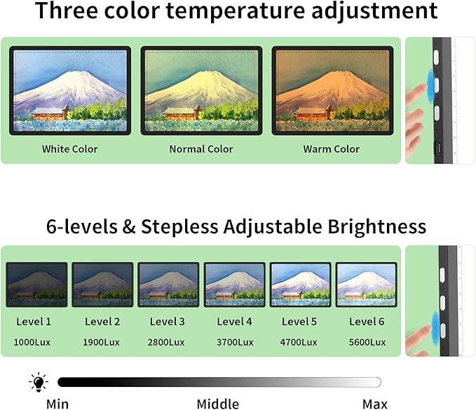 - 【3 Light Color Modes and 6 Levels/Stepless Dimming】This lightpad supports 3 colors of white light, natural light and warm light. Each lighting mode has 6 brightness dimming options. By shortly press the physical button to choose 6 levels brightness OR by long press the physical button to stepless adjust brightness. The Drawing Lightbox MAX brightness reach to 5400 Lux in the surface, which is great tool for cricut weeding vinyl. The light is even, non-glaring, no more eye fatigue when painting.