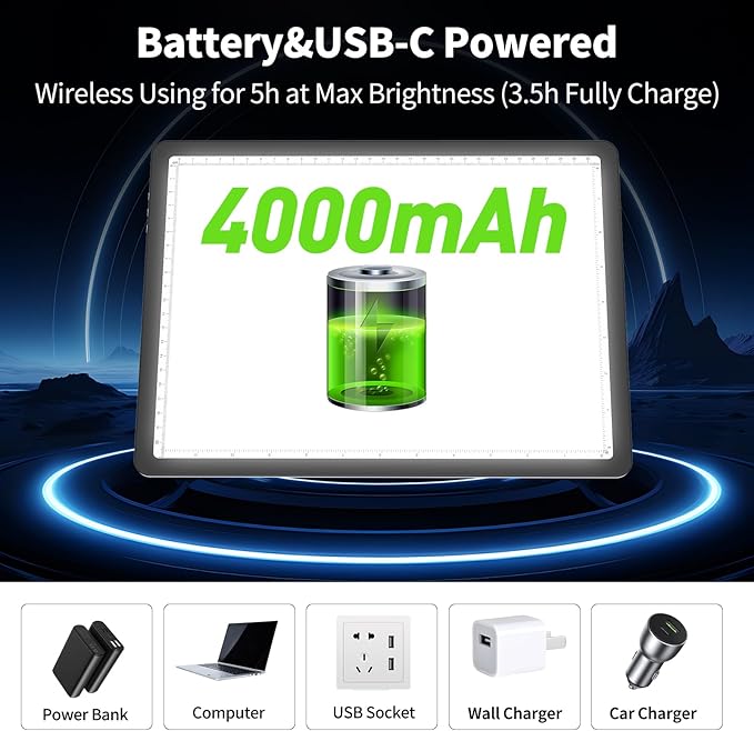 - 【 Wireless A4 Tracing Lightbox 】 With the built-in 4000mAh lithium battery, Phylosal LED Light Drawing Board allows you to work for 4.5 hours wirelessly with the MAX brightest mode continuously. It's more convenient for you to use this cordless Light Table anytime and anywhere without bringing any adaptors, USB cord, or power bank. Easy to carry and charge.
