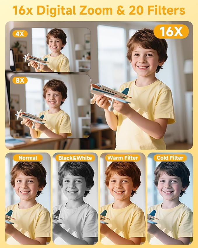 - 【16X Digital Zoom & Multi-function】:This kids digital camera not only supports 16x digital zoom(with a W/T button), but also support anti-shake, continuous shooting, face and smile detection, self-timer, and more.