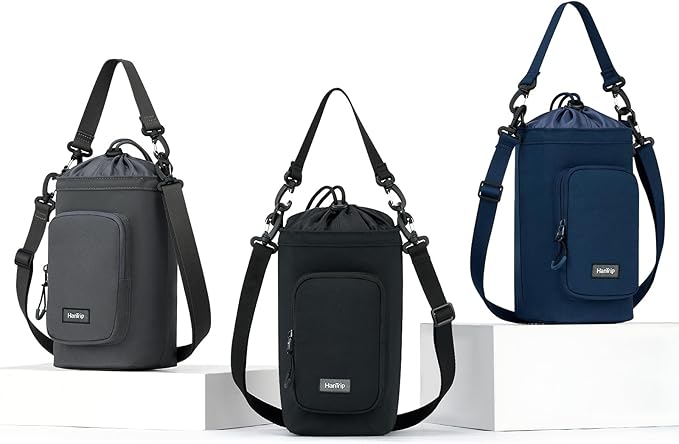 - [Water Bottle Holder with 2 Straps] Water bottle sling bag has 2 detachable and adjustable straps. One can be used as a top handle to hang on other objects such as luggage handle or backpack strap for hands-free convenience, while the other can be adjusted in length (28" to 58") for various carrying methods such as handbag, shoulder bag, sling bag, crossbody bag and so on.