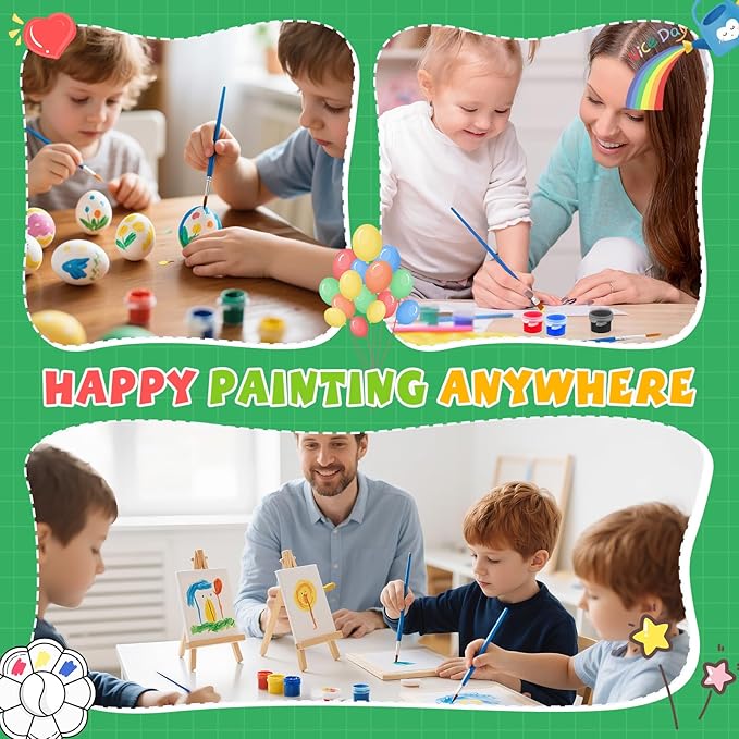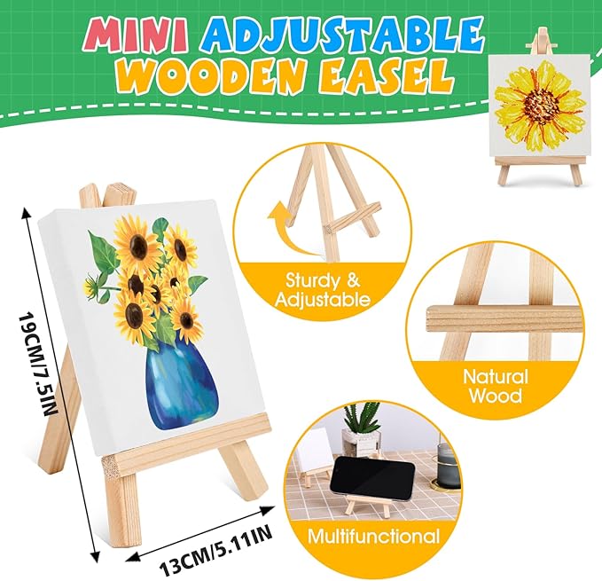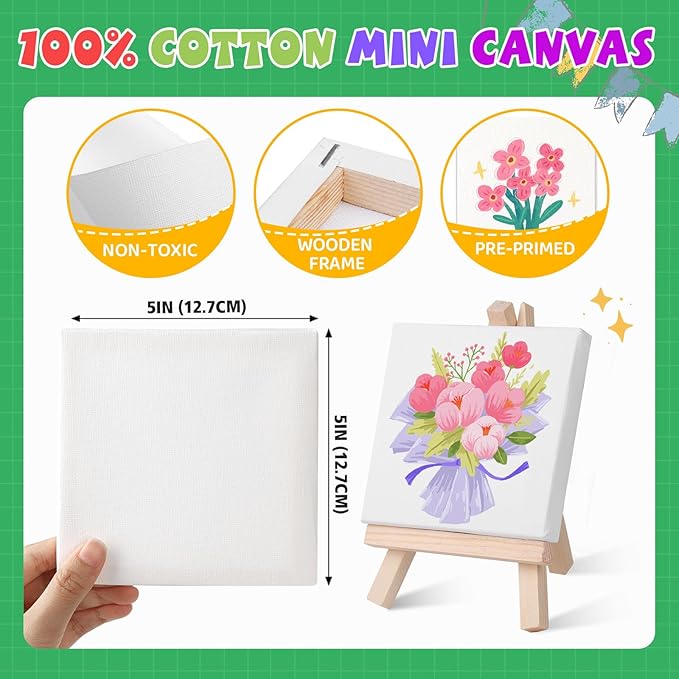 - 【 Mini stretched canvas and easel】: The 24 set mini acrylic paint set provide 5 x 5 inch small canvas with 7.5 inch mini wooden display easel. Kids can show their creations anywhere. Our mini canvas are safe and non-toxic, making them perfect for kids to use. These small easels are sturdy,can be used to hold photos, phones and more.