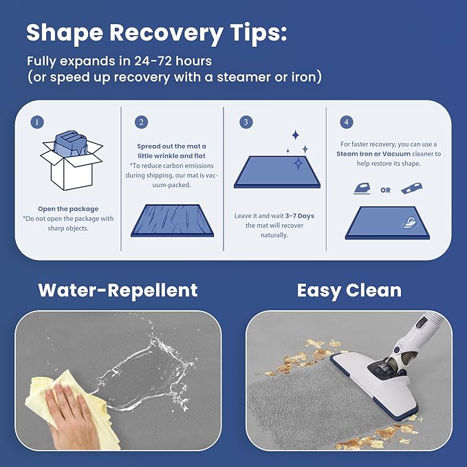 - 【TIPS】: Upon arrival, the baby play mat may need 3-7 days to fully rebound to its original size. If it appears slightly compressed, simply allow time or use a gentle iron to help restore its thickness and shape.