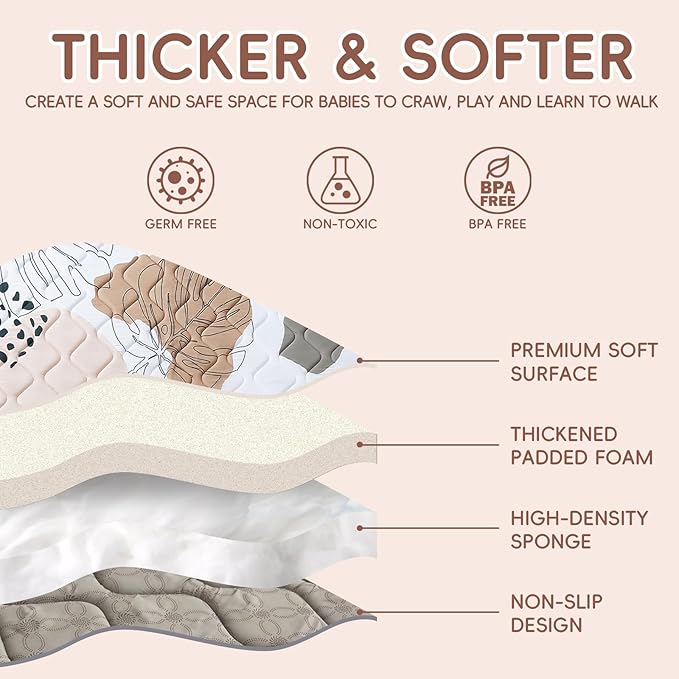 - Ultra-Plush & Supportive Comfort - Crafted with premium soft-filled foam and a waterproof, breathable fabric top layer, our extra-thick infant playmat creates the ideal cushioned surface for tummy time, crawling practice, and early motor skill development. The breathable, non-toxic materials provide a comfortable and safe exploration space for your little explorer.