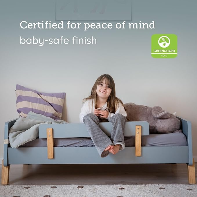 - SAFETY-FIRST DESIGN & DURABLE CONSTRUCTION โ Built for growing kids with a sturdy solid wood frame, real wood legs, and a slatted base that supports up to 110 lbs. Designed as a blue toddler bed with two guard rails positioned centrally for safer sleep. The toddler bed is close to the ground, ideal for toddlers who are active sleepers, offering easy, safe access and independence.