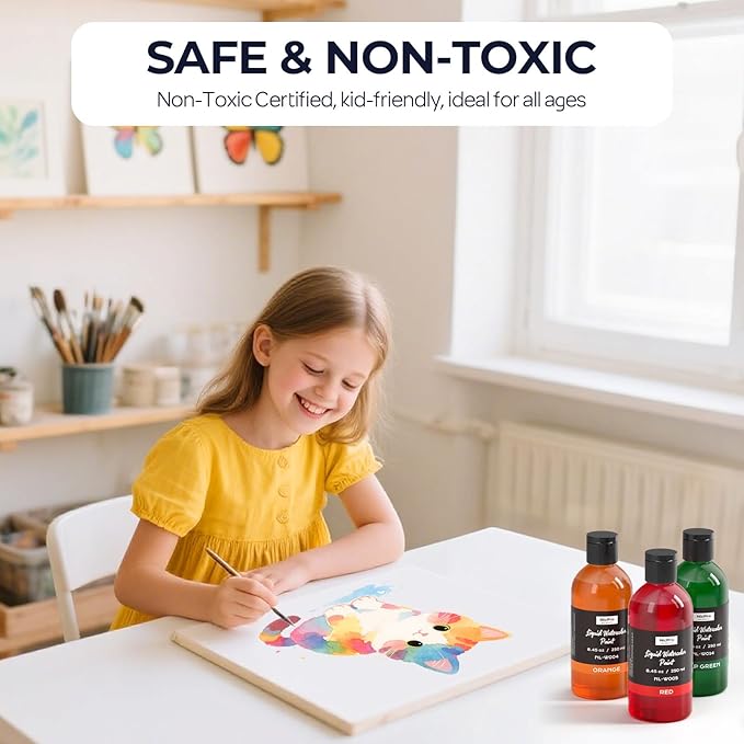 - STRONG PIGMENTS – NON-WASHABLE: These liquid watercolors feature ultra-rich, highly concentrated pigments that deliver vivid, intense color. However, they are not washable—they may permanently stain hands, clothes, and surfaces. Please use protective gloves and cover your workspace to ensure mess-free creativity
