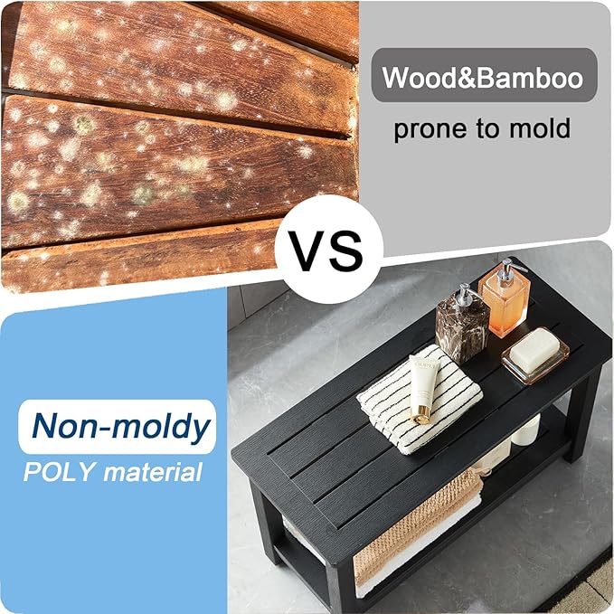 - 【Anti-mil-dew Material】Our shower bench seat is made of HDPS (polystyrene) with 304 stainless screws which never gets rust, this material is not easy to get m-o-l-d, rotting or crack after prolonged exposure to humidity, no splinters and no maintenance, 30 x 13 x 18 Inches enough large to sit (THE MOST IMPORTANT IS NO MAINTENANCE)
