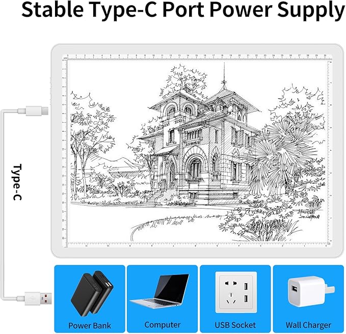 - 【 Standard A4 size, CM-INCH double scale 】 This super bright lightpad Overall Size is 35.2 x25.4 x 0.9 cm ( 13.9 x 10.0 x 0.35 inches ), and the visual working area is 31.6 x 21.8 cm ( 12.5 x 8.6 inches ). Illuminated area large enough for international standard A4 paper. This Light Drawing Sketch Pad has a dual scale of centimeters and inches to meet your various usage habits.