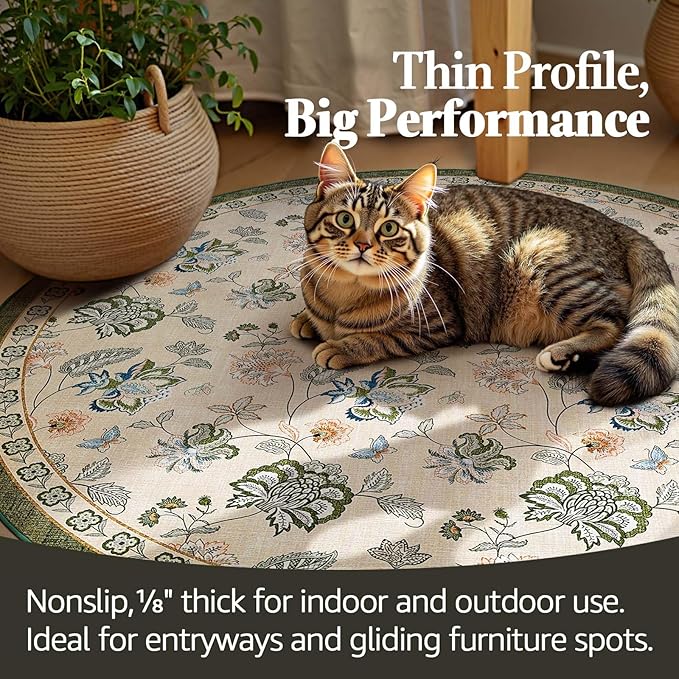 jinchan 7ft Floral Round Rug for Dining Room Washable Living Room Rug Vintage Romance Design Non Slip Indoor Floor Cover Lightweight Low-Profile Throw Carpet for Bedroom Porch Patio, Green/Beige