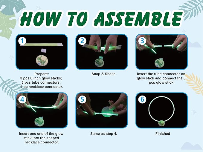 - Complete Jurrasic Dinosaur Glow Pack – Includes 6 dinosaur masks, 6 bracelets, 6 necklaces, 6 glow wands, 42 dino glow sticks, and 80 stickers — everything needed to light up your next celebration