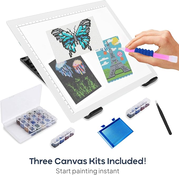 - Everything Included – Comes with 1 x EVA carry bag, 5 diamond painting pens (different types), 20 glue clay, 1 roller, 3 trays, tweezers, clips, fixing tool, reclosable bags, stickers, pen covers, and a sturdy stand—making it one of the most complete diamond painting light board sets on the market