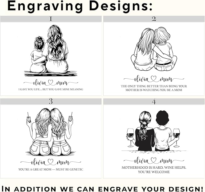 - Customizable: Our mother daughter keepsake box can be engraved with our available designs, including the daughter's name. The word "mom" can be adjusted to your preference—Momma, Mama, Mommy, Ma, Mum, Mother, Mimi, etc. The message "The only thing better..." can also be customized. Additionally, the inside of the lid can be engraved with your own message in various fonts we offer.