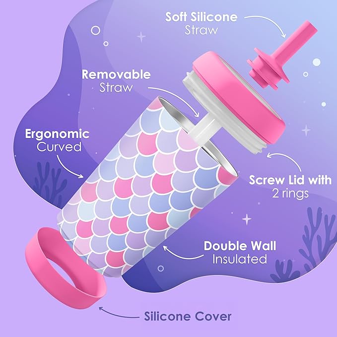 Kid Insulated Stainless Steel Tumbler with Silicone Straw, 12oz Sippy Cup for Kids (Mermaid Scale)