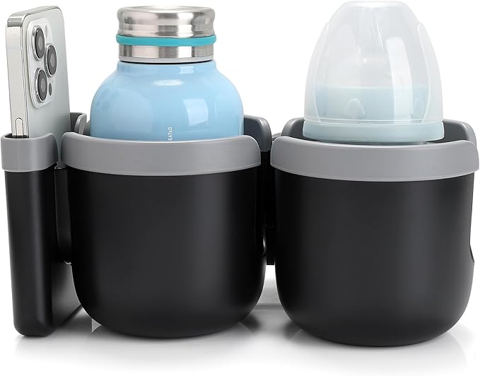 - This 2-in-1 stroller cup holder with a phone holder, it can load drinks bottles and cell phone at the same time. You can see new messages, incoming calls in the first time when you are pushing a stroller or running on a treadmill. It is applicable to most cell phones on the market.