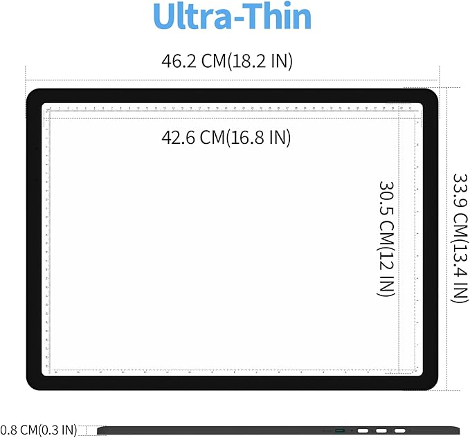- [Dual Measurement System & Spacious A3 Workspace]: CM/INCH dual scales adapt to global crafting standards.The size of tracing light box is 18.2 x 13.4 in (46.2 x 33.9 cm). Generous 16.8 x 12 in (42.6 x 30.5 cm) illuminated area fits A3 paper, diamond painting kits, and tattoo stencils. Ultra-slim 0.3 in (0.8 cm) profile slips into portfolios. Note: Surface is scratch-resistant but avoid sharp tools