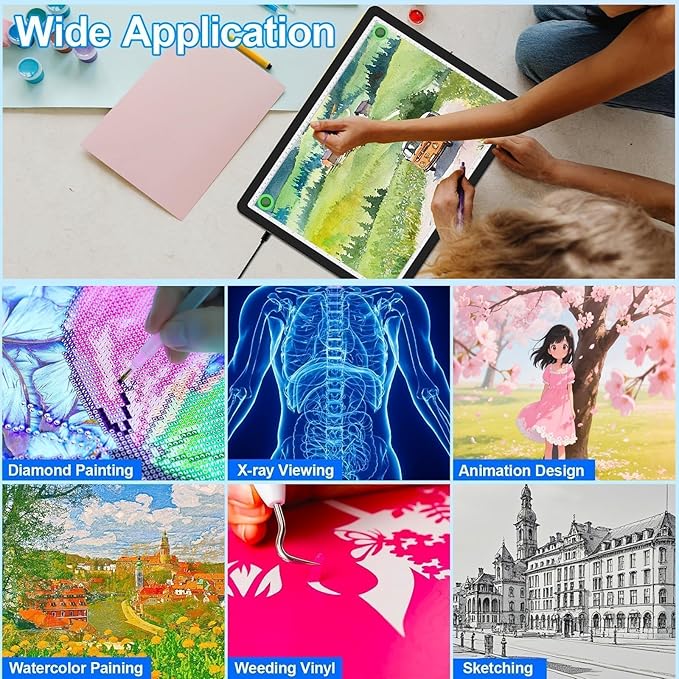 - [Multi-Craft Essential with Full Accessories]: This light board is Ideal for tracing, weeding, diamond painting, drawing, sketching, 2D Animation, X-ray viewing etc. LED light pad streamlines precision work. Includes USB-C cable, 4 magnets, and illustrated guide. Gift-ready packaging makes it perfect for artists, teachers, and hobbyists. If you are not satisfied with your purchase, please contact us, we will reply you within 24 hours