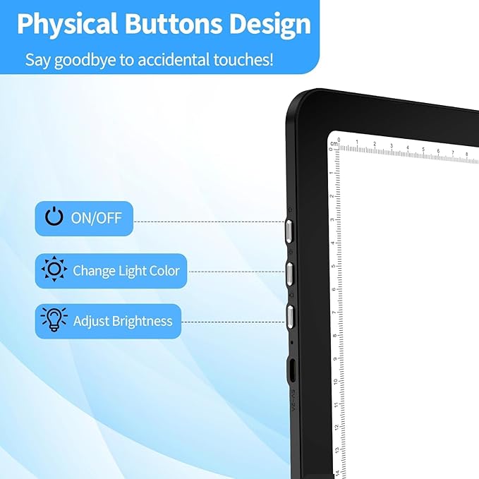 - [Dual Measurement System & Spacious A4 Workspace]: CM/INCH dual scales adapt to global crafting standards. The size of tracing light box is 13.9 x 10.0 in (35.2 x25.4 cm). Generous 12.5 x 8.6 in (31.6x21.8cm) illuminated area fits A4 paper, diamond painting kits, and tattoo stencils. Ultra-slim 0.35 in (0.9 cm) profile slips into portfolios. Note: Surface is scratch-resistant but avoid sharp tools