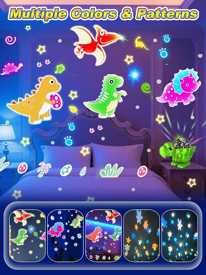 - Unique Design for Kids: The lighting in our room features two interchangeable projection films that display distinct patterns. Upon changing the film, the Starlight projector fills the room with scattered star projections and dinosaur-themed images, creating an atmosphere of a romantic starry sky and a magical dinosaur world. These diverse patterns are designed to engage children's interest and enhance their comprehension of the world.