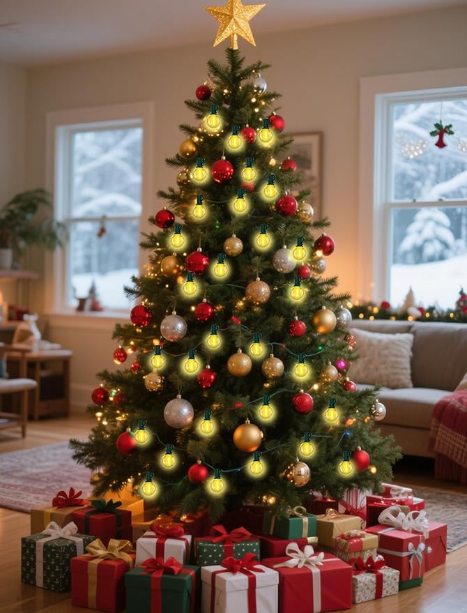 - Easy to Install & Versatile Use: Outdoor christmas string lights socket has a clip on the side. Simply hang or wrap round Christmas decorations bistro lights along rooflines, fences, trees, stair railings or patios. Hanging patio lights perfect for Christmas decorations, wedding receptions, garden parties, or cozy indoor setups, to transform your space into a warm, festive atmosphere.