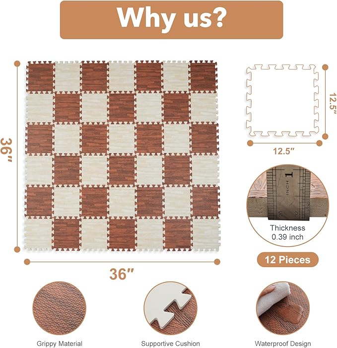- Cold-proof: Each 0.4" thick cushioned tiles acts as a barrier between your feet and cold, hard floors. The textured surface, combined with the mat’s thickness, offers a cozy, flannel-like feel that adds an extra layer of warmth, making every step feel like a sunny day.