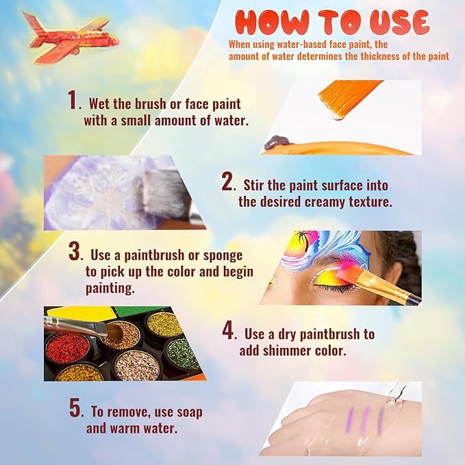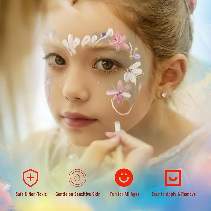 - Kid-Friendly & Safe for Sensitive Skin - Formulated with gentle, water-based ingredients, our face paint is non-toxic, paraben-free, and cruelty-free, making it safe for both kids and adults. Perfect for sensitive skin. Please perform a patch test behind the ear before use, as skin sensitivity may vary.