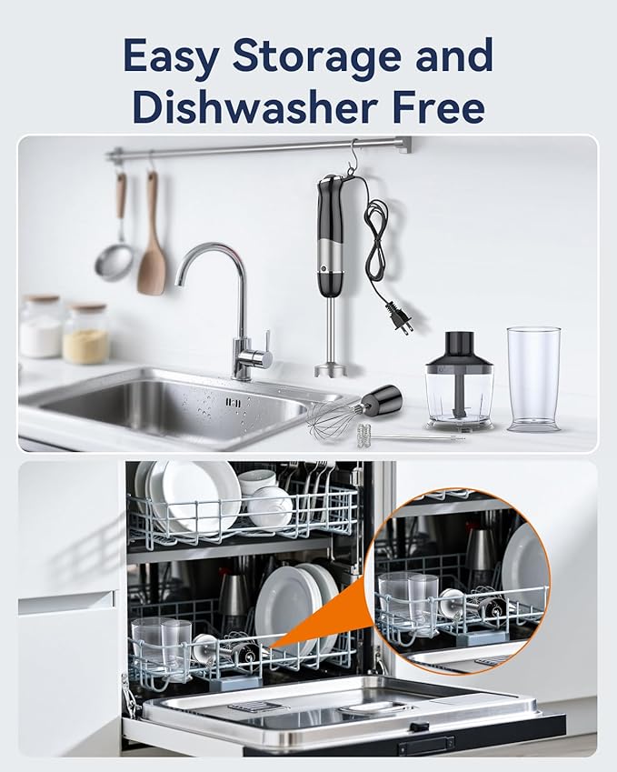 - Easy to Clean: The snap-on/off detachable attachment design makes this emulsifier blender easy to connect and disconnect and a breeze to clean as they all comes off easily than a regular blender. You can just rinse it off after use or wash it in dishwasher. It can hang with the hook and the main body can easily be cleaned by wiping with a soft damp cloth. (except blender shaft and chopping bowl lid requires hand wash and the water temperature of the dishwasher should be below 75ยฐ).