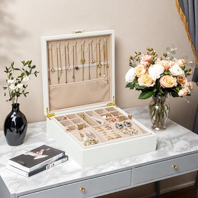 - [Exceptional Storage Capacity] This jewelry box features a smart 2-layer design with a top flip-top compartment and a bottom pull-out drawer, offering ample space to organize and store all your precious accessories, including rings, earrings, bracelets, watches, and more,Its medium - sized design, measuring 9.52 inches in length, 7.36 inches in width, and 3.5 inches in height,fits perfectly on any dressing table or bedside cabinet, making it a stylish and practical addition to your personal space