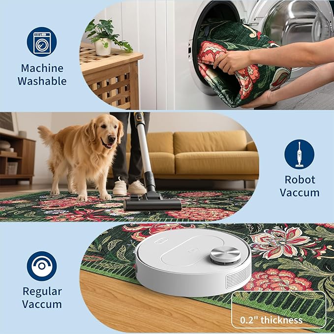 - 【floral Botanical Design】Inspired by floral fabrics, this botanical design features vivid, mirrored big floral motifs that attract the sweetest hummingbirds in a garden-like setting. Petals in bright yellow, lavender, pink, and red bloom beautifully against diffrent background. Water-resistant, stain-resistant, and machine-washable. Rug colors may vary slightly according to your device and the lighting in your space