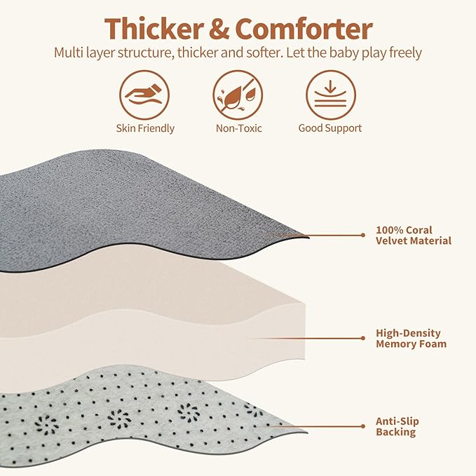 - 【1.4in Thickened Memory Foam Play Mat】Crafted from ultra-soft velvet fabric with high-density memory foam padding, this play mat measures approximately 1.4 inches thick. The SUNYRISY nursery baby rug offers a breathable, comfortable surface that is gentle on baby's skin and resistant to color fading. Its thick padding helps cushion falls, making playtime safer and more enjoyable for toddlers