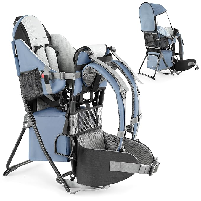 besrey Baby Backpack Carrier, Toddler Hiking Backpack with Safety 3-Height Seat, Adjustable Straps&Waist Belt, Foldable Frame Lightweight Large Capacity Child Carrier for Hiking (Haze Blue)