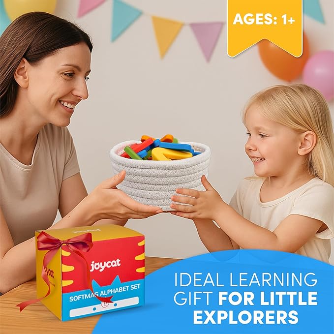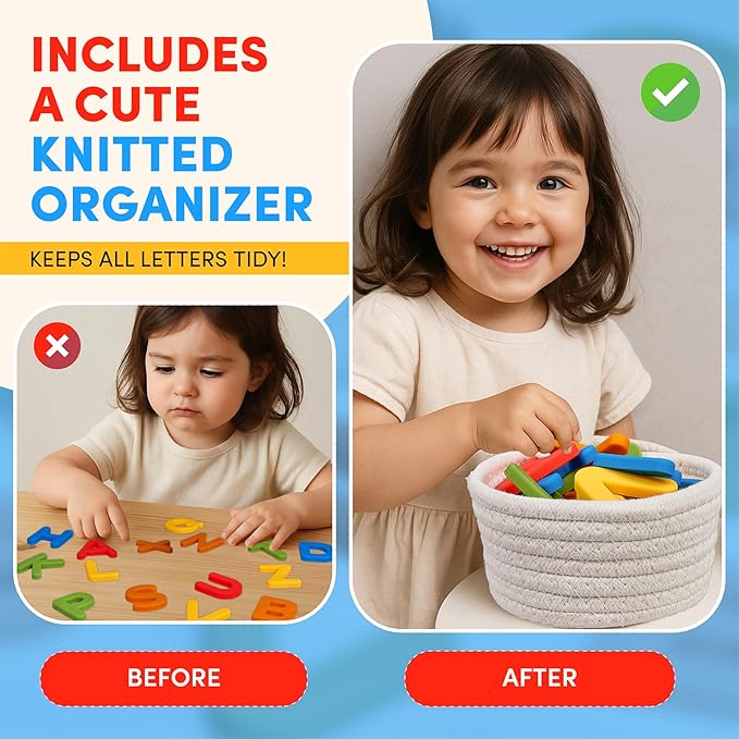 - What's in it: This silicone alphabet set includes 26 chunky letters (A-Z) in 5 high-contrast colors, housed in a reusable cotton-linen storage box. Each silicone letter features embedded magnets for reliable adhesion to refrigerators or whiteboards. Sized for small hands to explore letter shapes