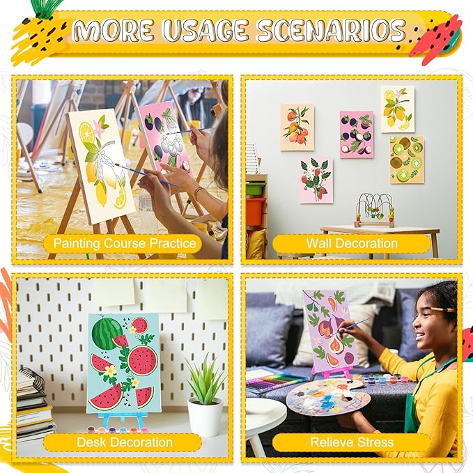 - 10 Pre Printed Canvases: 10 kinds of fruit patterns are engraved on the pre drawn board; Include Strawberries, watermelon, lemon, pomegranate, banana and other patterns, the size of: 7 x 5 x 0.1inch/18 x 13 x 0.3cm, cute and easy, you can use the provided paint to color according to your own aesthetics, improve your painting creativity in the process, and also reduce stress and relieve anxiety