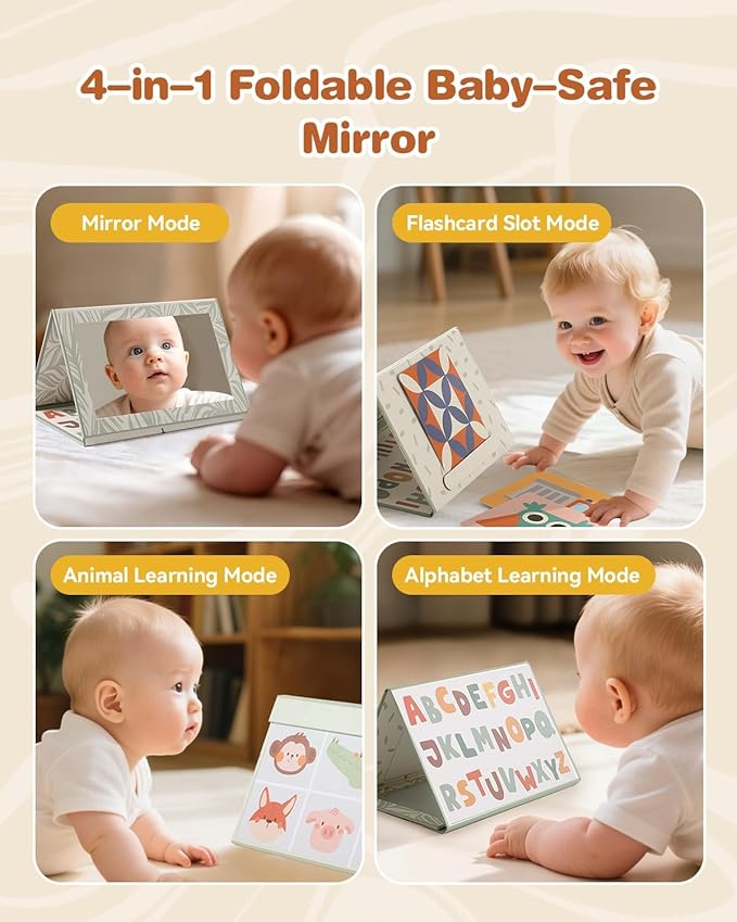- 6 Developmental Accessories for Every Stage: Includes a Baby-Safe Mirror, Elephant Rattle, Cloth Book, Wooden Bear Rattle, Sensory Ball, and Visual Cards—each designed to support different developmental skills, from visual focus and tactile exploration to auditory awareness and fine motor coordination.
