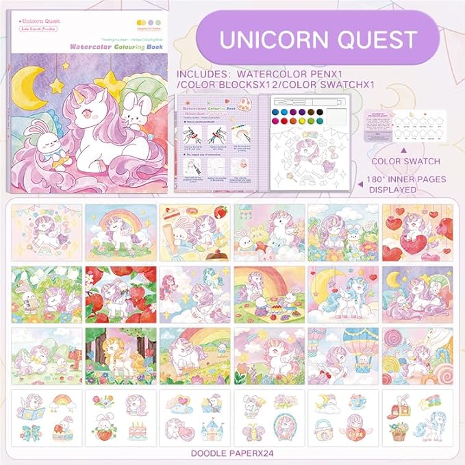 - Includes 24 Unicorn-Themed Pages with Multiple Ways to Play. Say goodbye to traditional coloring! This book includes 24 pages of princess-themed illustrations and unlocks multiple creative uses—like coloring pages, journaling, postcards, quiet books, reusable stickers, and bookmarks.