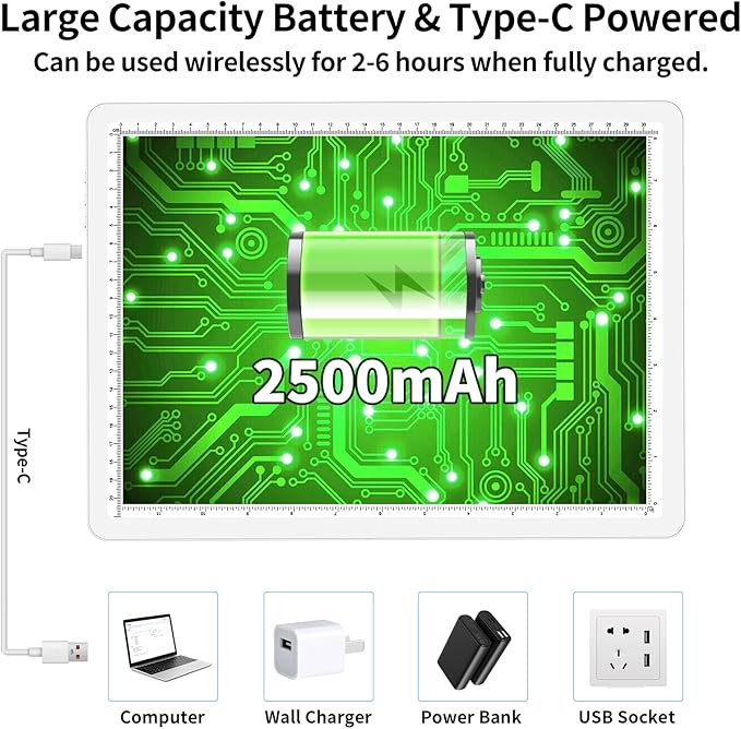 - 【 High Capacity Battery Powered Lightbox 】 With 2500mAh rechargeable lithium battery, the magnetic tracing pad can work continuously for 2-6 hours wirelessly. Convenient for you to use it anywhere in your home or on your journey. Equipped with upgraded fast charging Type C cable, easy to access any Type-C port, charging is fast and efficient. Both battery mode and charging mode are applicable. Also,the USB-C interface is more stable than the Micro interface.