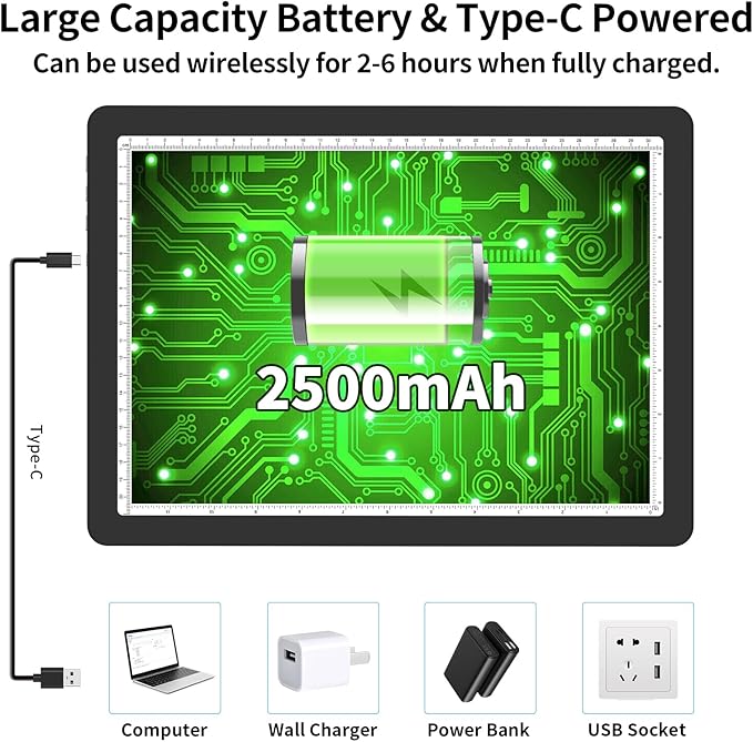 - 【 High Capacity Battery Powered Lightbox 】 With 2500mAh rechargeable lithium battery, the magnetic tracing pad can work continuously for 2-6 hours wirelessly. Convenient for you to use it anywhere in your home or on your journey. Equipped with upgraded fast charging Type C cable, easy to access any Type-C port, charging is fast and efficient. Both battery mode and charging mode are applicable. Also,the USB-C interface is more stable than the Micro interface.
