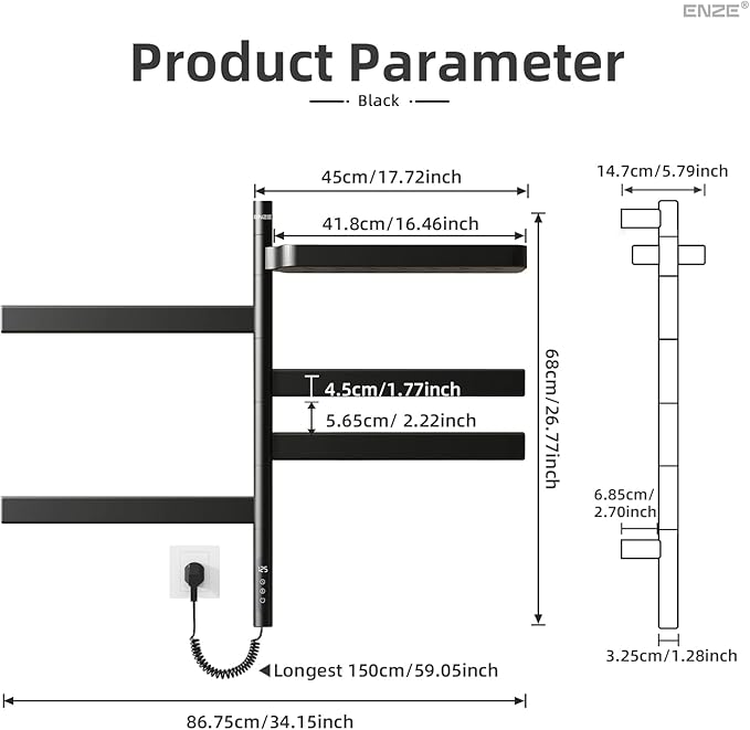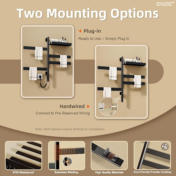- 【Flexible Installation: Hardwired or Plug-In】 Designed as a hardwired towel warmer or plug-in unit, install this wall-mounted heated towel rack with included hardware and instructions. Great as a towel heater rack or electric towel drying rack for any bathroom setup.