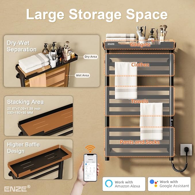 - 【Smart WiFi Towel Warmer with Voice Control】 Control your electric towel warmer anytime via the WiFi towel warmer function through Tuya app, Alexa, or Google Assistant. Experience hands-free convenience with this smart towel warmer designed for modern living.